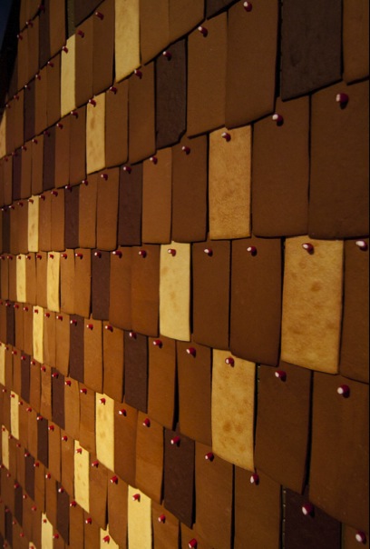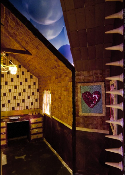 Over 2,500 gingerbread tiles make up the outside shingling of the house along with some vanilla and chocolate shortbread tiles that create the cobbling effect. The interior is crafted out of belgian waffles, wafers, and bourbon biscuits. Much was done in the way of research and testing to acquire the strongest and most durable materials that were also edible. Overall, it took 177lbs of gingerbread, 144lbs of chocolate ganache, 25 liters of icing, 660 gallons of marshmallows, 400 meringues, and more gummi candies than one can count to create this belly-ache inducing home.