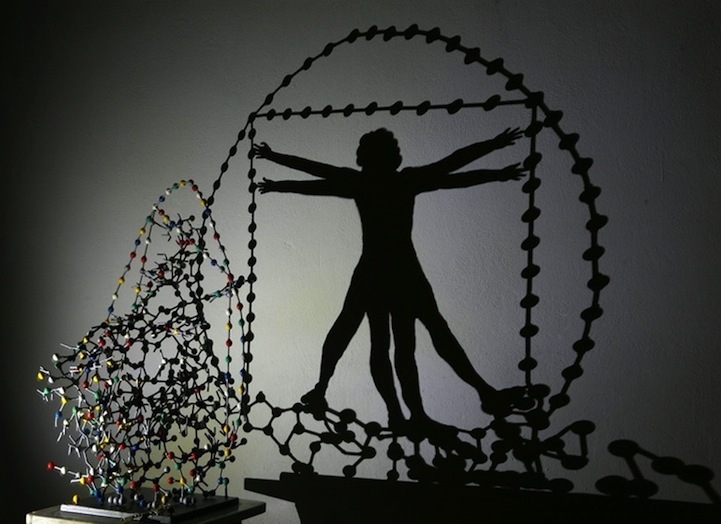 At first glance, Greek artist Tedosio Sectio Aurea's iron sculptures might seem pretty ordinary. However, when lit from the precise angle, the sculptures spring to life with shadows that reveal a whole new form. Above, a bouquet of colorful metal flowers casts a shadow of a woman holding leaves, while another sculpture features an interconnected set of 350 small, metallic balls that casts a shadow of Leonardo Da Vinci's famous sketch Viturvian Man.