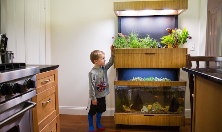A process called aquaponics is behind the success of the Grove Ecosystem. An aquarium sits below the garden, and its fish digest their food to produce ammonia-rich waste. Beneficial microbes convert the ammonia to nitrates (organic plant fertilizer), which simultaneously supplies the plants with nutrients and the fish with clean water.