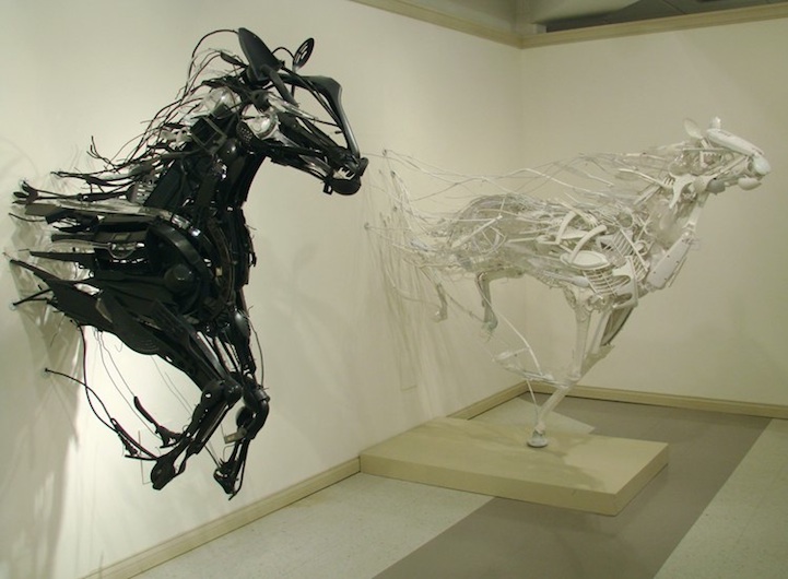 Sayaka Kajita Ganz created these wild horse sculptures from trash-picked objects like plastic utensils, toys, and metals. She says, “By building these sculptures I try to understand the human relationships that surround me. It is a way for me to contemplate and remind myself that even if there is conflict right now, there is a way for all the pieces to fit together.”