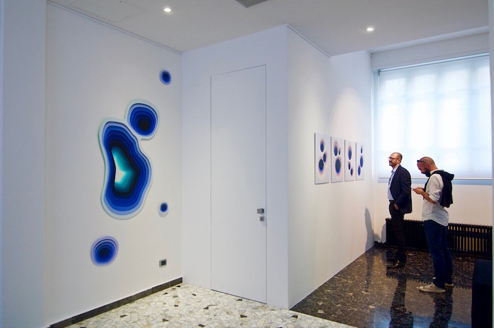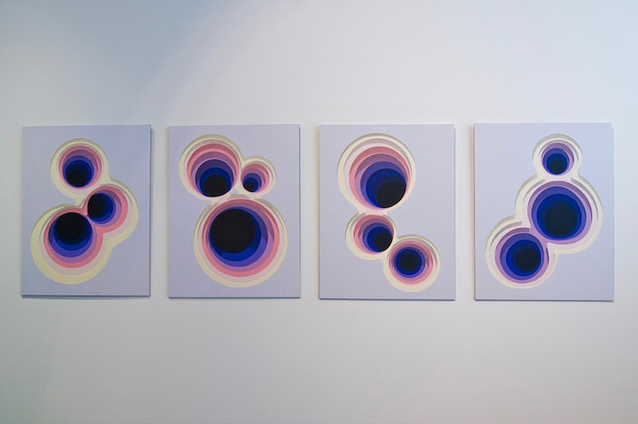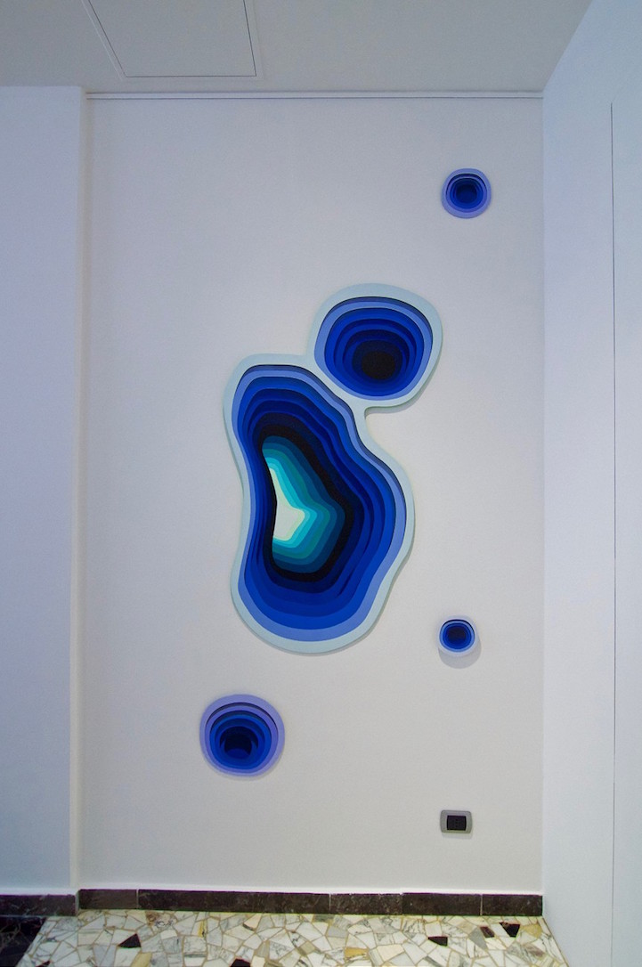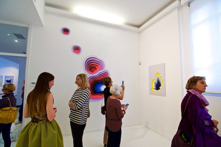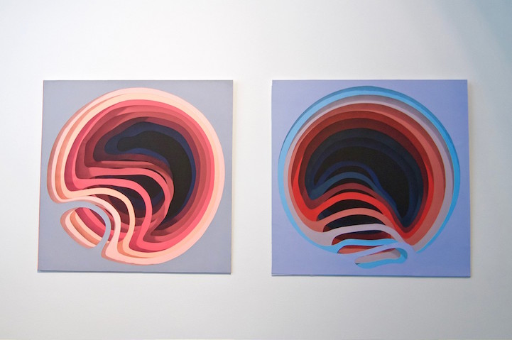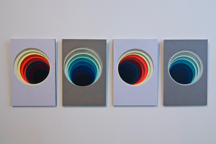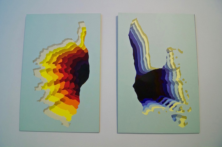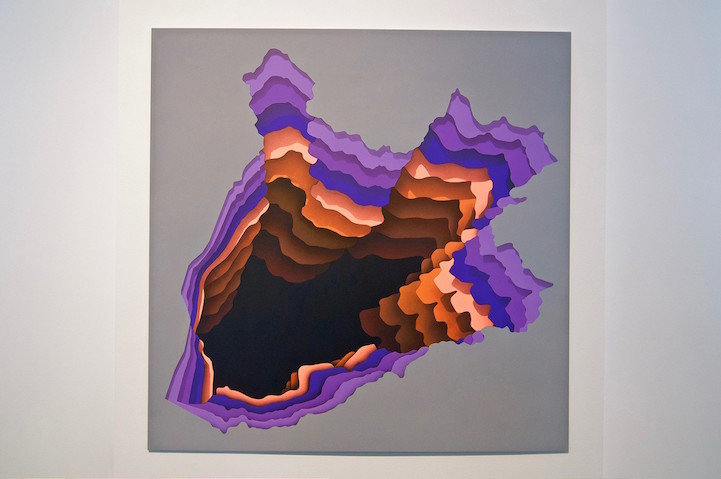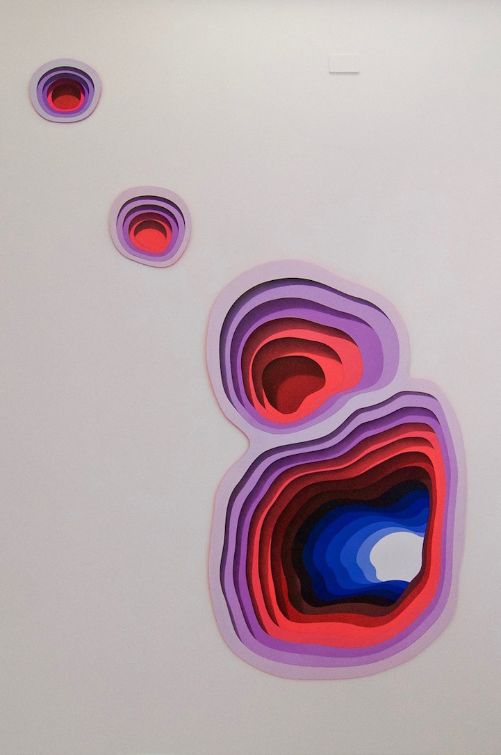 Selected from several of the artist's series, with titles including Portal, Limbus, Void, Fluss, and Abyss, some of the pieces present as craggy chasms like sliced geodes, while others take the form of smooth circular holes. Each multi-hued variation demands a closer look, inviting viewers to jump face-first into an alternate reality.