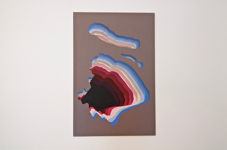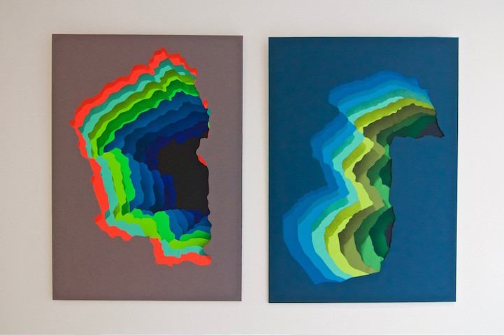 Though smaller in scale than his street art, these new works might be even more remarkable. The compiled tones pop like paper cuts mounted with spacers in between the different slivers, receding into deep orifices—but in fact, the concave effect is an illusion created by 1010's careful contrasts of light and shadow, created using nothing more than paint.