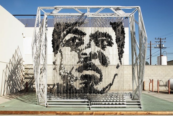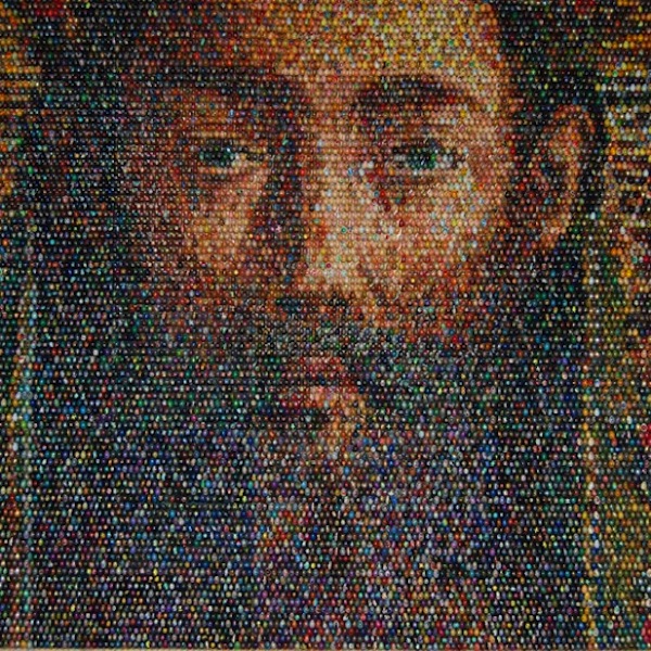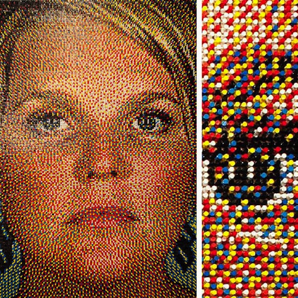 Who needs paint when you have push up pins? Michigan-based artist Eric Daigh uses basic colored pins – red, yellow, blue, white, and black – and puts them into his canvas – poster board. About 25,000-100,000 pins can be found in each portrait. Talk about patience!