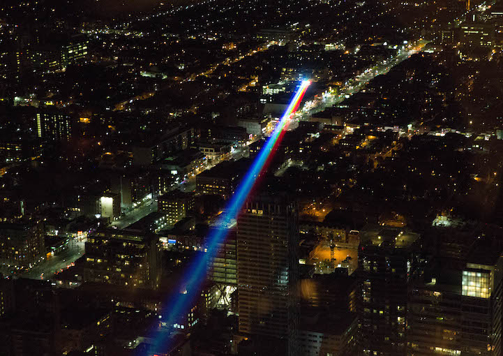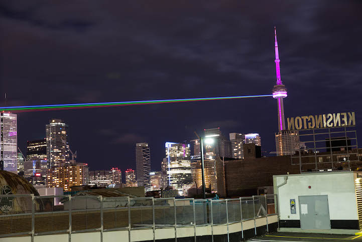 During the past few nights, residents of Toronto have been mesmerized by a powerful laser rainbow beaming across the night sky.  The high specification laser light projection starts in Chinatown and lands squarely onto Toronto's iconic CN Tower, the tallest free-standing structure in the Western Hemisphere.  According to New York and Berlin-based artist Yvette Mattern, the laser rainbow is a powerful and luminescent symbol of peace and hope that embraces geographical and social diversity. With a beam that has a trajectory of up to 60 km (37 miles), the project literally paints the sky with seven powerful lines, representing the beautiful spectrum of colors found in a rainbow.