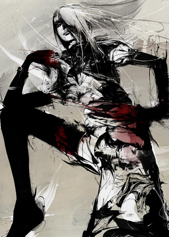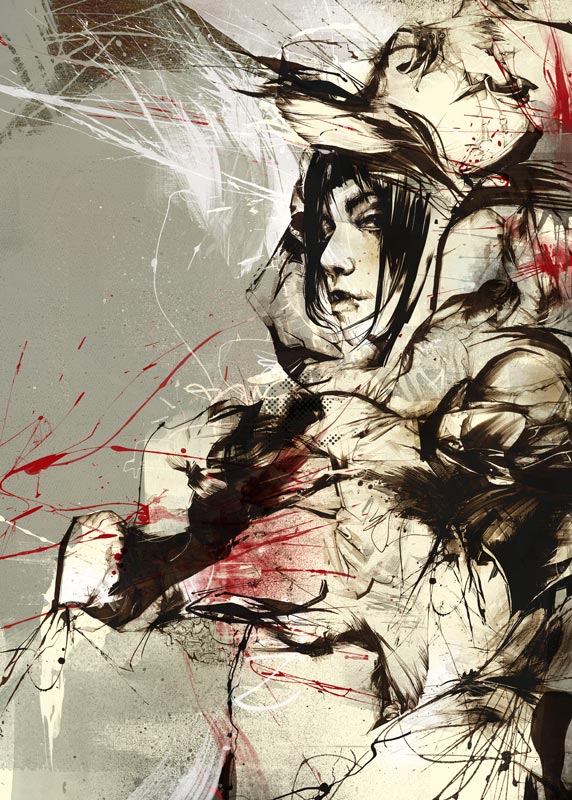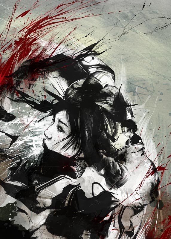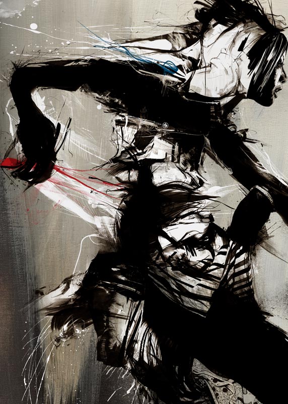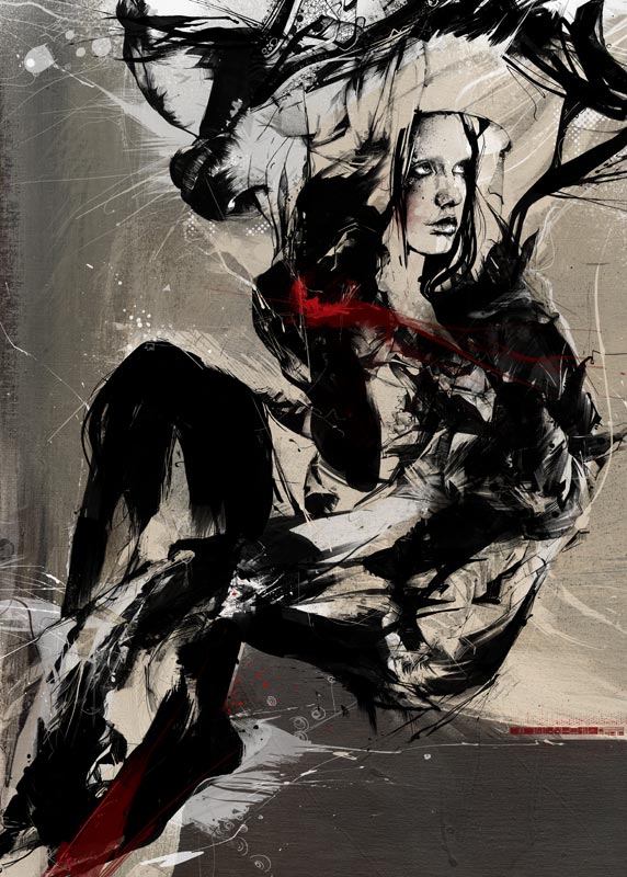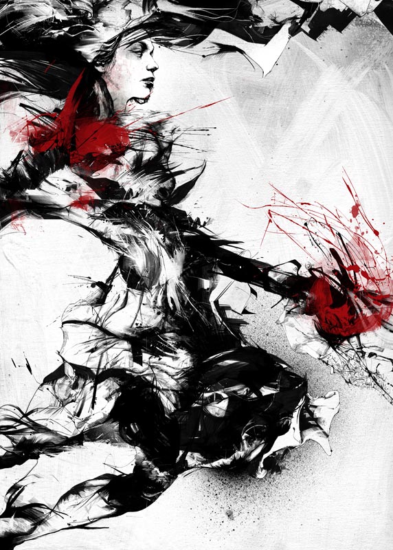 A new set of edgy art was just released by London based artist Byroglyphics (aka Russ Mills). We've written about Russ Mills before, how his messy art draws us in and captivates our attention. He calls his style “kitchen sink surrealism.” Mills uses bold splashes of color to create movement and you can tell he's been influenced by Japanese pop culture just by the way his (Photoshop) brush strokes fall. As he's stated, “I love the way that every piece of popular culture from the recent past is smashed together into a garish soup and regurgitated into real life with absolutely no boundaries.” You'd be surprised to find that Mills starts his work by using a simple Bic pen. In fact, Mills describes his process in a very candid way. “My illustrations are not too scientific, they begin life as sketches in ink, the tool of choice is the Bic ‘fine' because it gives me a lot more mileage than more expensive, snootier fine liners that break if you give them too much stick. The sketch is transported into my ageing mac and then abused in photoshop (you may have heard of it) i use this because of the joy of multiple undo's plus its the closest I can get to painting without painting. The next stage in byroglyphics' life is to turn these illustrations into big canvases, it's taken me many attempts to get to a stage where i'm confident enough to attack canvas and leave the relative safety of the computer, as with everything else it's a constant learning curve, sometimes a downward one.”