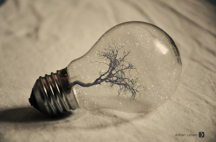 Albanian photographer Adrian Limani reevaluates the world around him and develops his own surreal “art objects.” The self-taught photographer captures a variety of images that inspire him, both from nature and still life, and combines them to produce intriguing subjects. His work with light bulbs is especially fascinating. Limani uses two, sometimes three, different images to brilliantly create each of his light bulb images. Like unusual snow globes, his photo manipulations exhibit artifacts from life, particular samples from nature including entire trees, within glass domes.