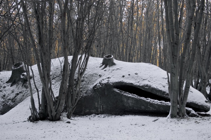 Argentina-based artist Adrin Villar Rojas knows how to make a big statement. In 2009, Rojas constructed a massive public installation titled My Family Dead that depicts a whale in the middle of a forest in Ushaia, Argentina. The scene is a disturbing spectacle of a dead animal carcass that leaves the viewer saddened and baffled. How does an entire whale wind up in the woods? Luckily, it's not an actual whale, but a well-crafted replica made of wood, rocks, and clay. Nonetheless, the implications of human impact on the natural world remain engrained in one's mind.