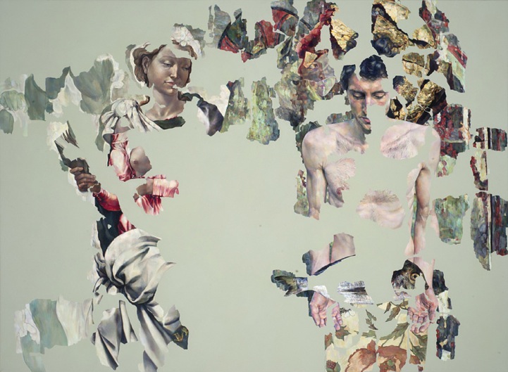 The artist uses very thin paints and soft color palettes to maintain a flat surface where the figures and forms are always the main focus of each piece. The detailed, visible pieces, similar to torn bits of paper, combined with the mystery and intrigue of the empty areas, form a tension that evokes an emotional response to each scene. The artist says, “I consider it important to maintain dichotomy. Thus tension and calmness, harmony and dischord are simultaneously present. An interesting balance comes into being, which from the painting pulsates.”