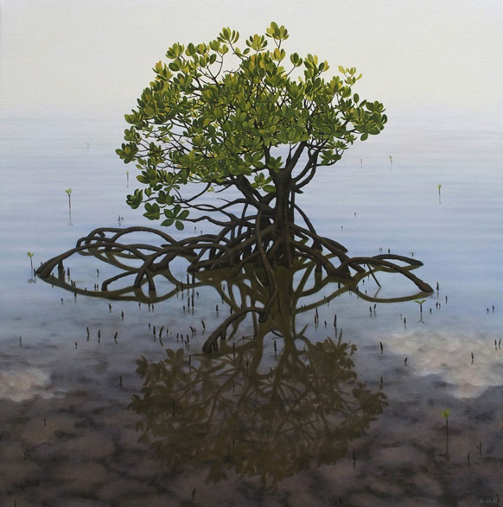 Adapting her style from old master techniques, Shah infuses an individuality into each of her paintings. Toying with natural colour schemes, alternating light and dark to create shadows, she produces unique imagery from a familiar subject matter. Sprinkling in the occasional wild animal, her work remains interesting and reflects strong ties to the natural world that translate to a visually comforting collection. Shah's brushwork brings to mind famous impressionist work (think Monet's Water Lilies), yet there are traces of characteristic Japanese artistic methods apparent in her reflections of the natural element as well.