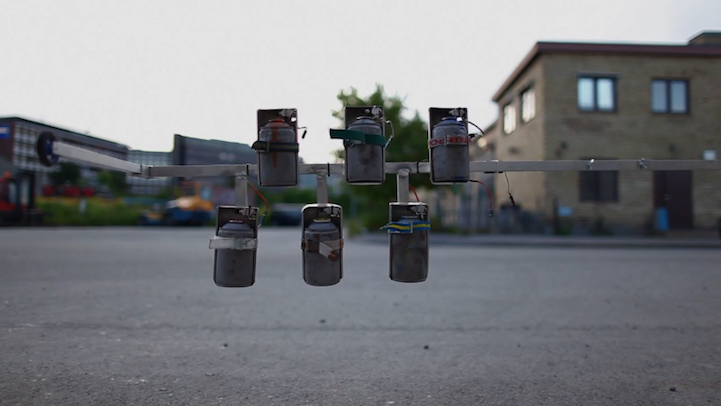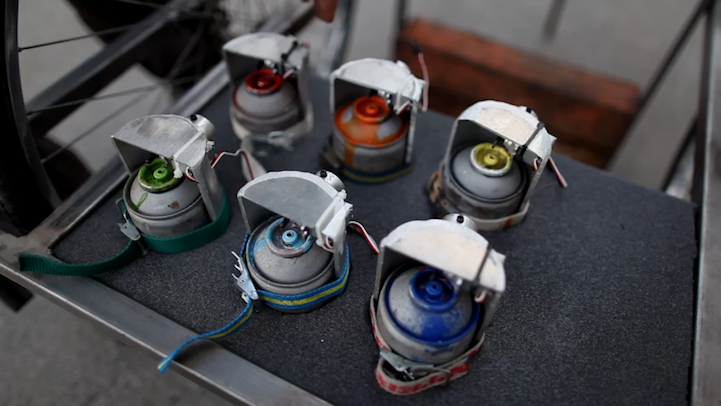 This particular device includes a long, mechanical arm holding six cans of spray paint and attached to a rotating device. With the machine extending back behind his bicycle, Akay can control the rotating arm with a remote control secured to the bicycle handle. When he pushes the button, the arm moves upward in an arc-path, spraying the bottles of paint and forming a graffiti rainbow along nearby walls. (Check out the video below to see the machine in action).