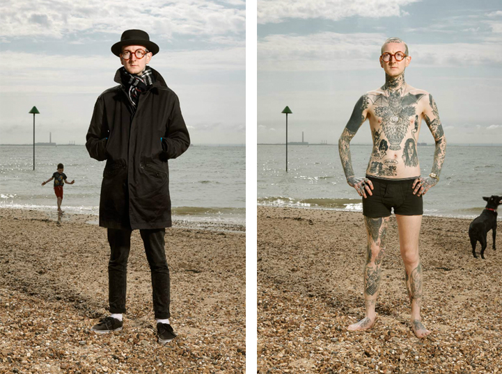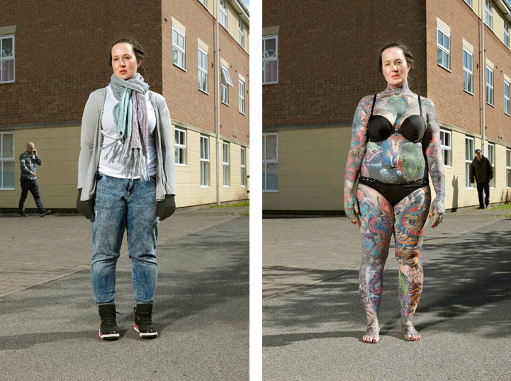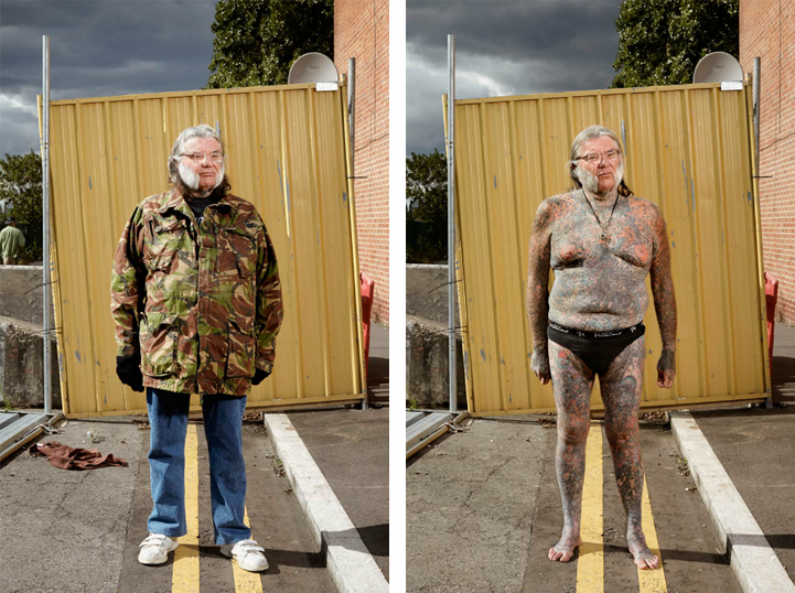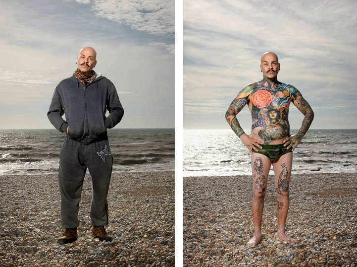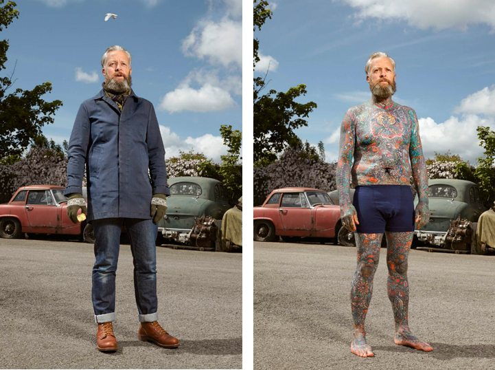 For many people, their skin is a canvas on which to display beautiful body art. Some folks are satisfied with one or two tattoos, but others keep going until entire areas of their body are camouflaged in colorful ink. British photographer Alan Powdrill documents these brazen bodies in COVERED, an homage to those willing to go to the tattooing extreme. His series features two images per person: one where they're bundled head-to-toe, and another where they're showing off their complex tapestry of tattoos.
