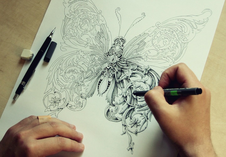 Konahin's latest work centers around small winged insects like the butterfly, bee and dragonfly. Called Little Wings, the series was inspired by a summer trip to the Netherlands where the artist was able to live away from the city and immerse himself in the countryside. Using just simple black pens, fineliners and India ink, the artist meticulously drew these winged creatures, in his usual mind-blowing way, with incredible precision and detail. Just stunning!