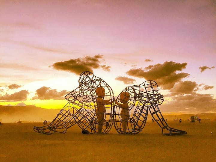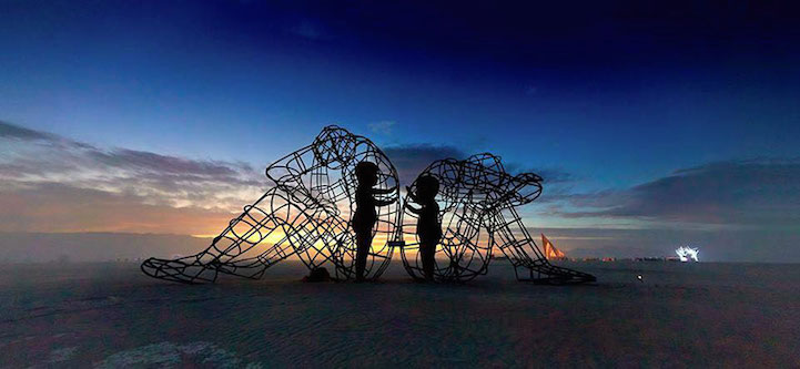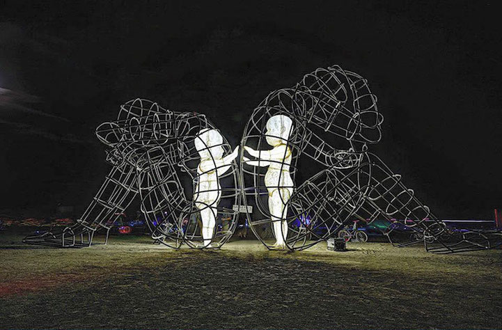 Ukrainian artist Alexander Milov delighted Burning Man‘s festival-goers with a piece that allowed them to reconnect with their inner child. The Love sculpture features two wire adult figures sitting back-to-back. Inside their frames stand two children who are reaching out to one another. As the sun sets and the moon rises, the two young figures light up and set the surrounding area aglow. The stunning contrast between the wire and this illumination makes viewers stop and stare as they contemplate the display's meaning.