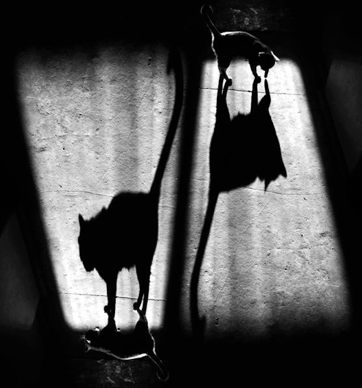 The Russian artist creates all kinds of intriguing graphic shadow art. His subjects, including groups of pigeons, cats, dogs, and even people, are all perfectly placed with shadows perfectly cast. The sharp contrast of black and white tones along with Bednij's composition create a visual pattern of shapes in both the negative and positive spaces. Similar to an M.C. Escher drawing, Bednij's work creates impossible realities that capture his viewers' attention and keep us lingering in an attempt to better understand the visual whirl of confusion.