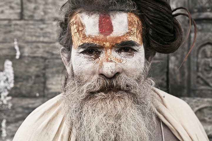 Of the 4-5 million who exist, Pazoumian photographed a select few with two stylistic approaches. First, he features each Sadhu as a small speck within a large, surrounding environment. While observing these portraits, viewers may feel like voyeurs, catching a glimpse of a Sadhu in private solitude. Second, Pazoumian got very up-close and personal, creating a tightly cropped portrait of each man's face and inviting viewers to become acquainted with each subject.