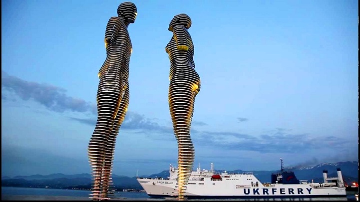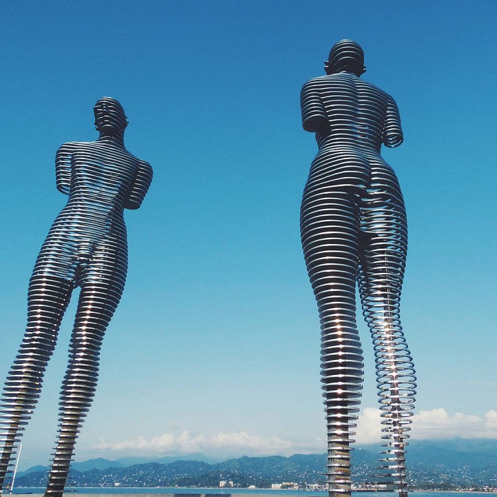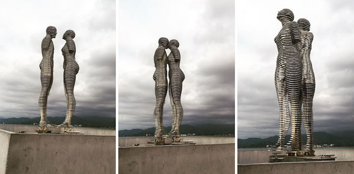 Originally designed in 2007 with the name A Women and Man, the sculpture was installed in 2010 and subsequently renamed Ali and Nino, inspired by the novel written in 1937 by an Azerbaijani author using the pseudonym Kurban Said. It tells of a tragic love affair between a young Muslim Azerbaijani man and a Christian Georgian princess during the First World War. Theirs is a story of passionate love torn apart by culture, religion, and war, and has been hailed as one of the romantic novels of all time.