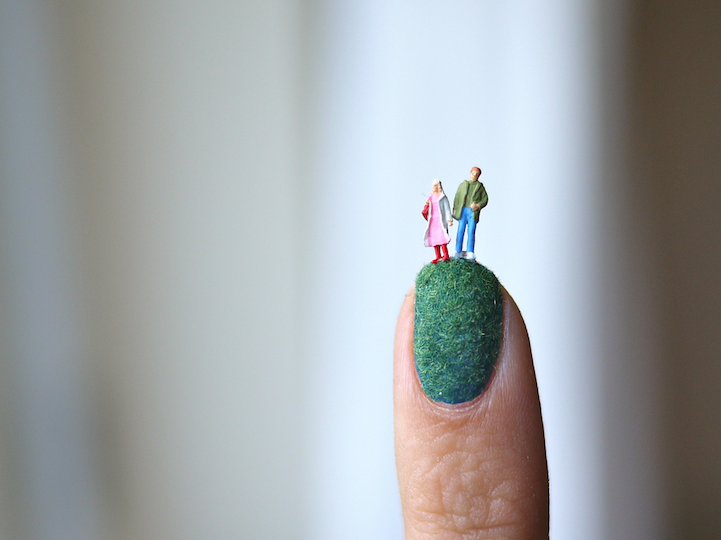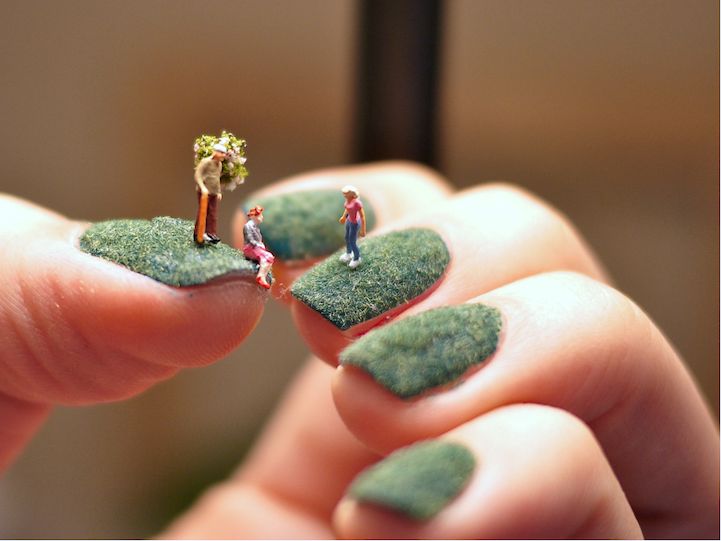 Recently, Alice Bartlett covered her fingernails with textured green flock and, from that moment, an idea was born. Inspired by the color and texture, she decided that her nails would be a great backdrop for miniature scenes of people doing daily activities. So she identified her favorite tiny models and created these scenes on top of each nail. She then photographed the imaginative stories that came to life in her hands.