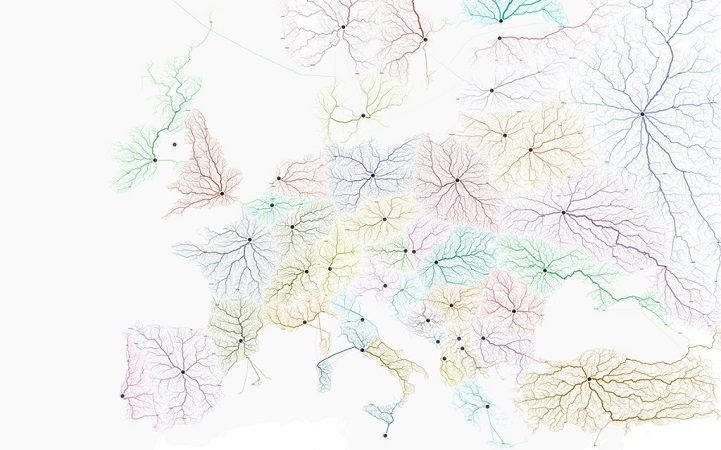 By overlaying a 10,231,707 square mile grid over a map of Europe, and then subdividing it into cells, they obtained a starting point for journeys that could begin within each of the 486,713 individual cells, and theoretically end in Rome. They then used highway data and a routing engine to design an algorithm that calculated routes and examined which were most heavily trafficked–represented by more prominent shading on the map. The resulting design is beautiful, with highways and roads transformed into delicate spidery veins that trace their way across the continent.
