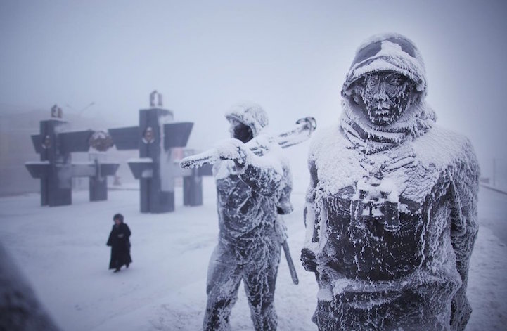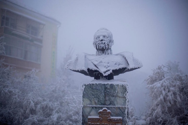 A statue of Ivan Kraft, one of the first governors of Yakutia, stands caked in frost most of the year.