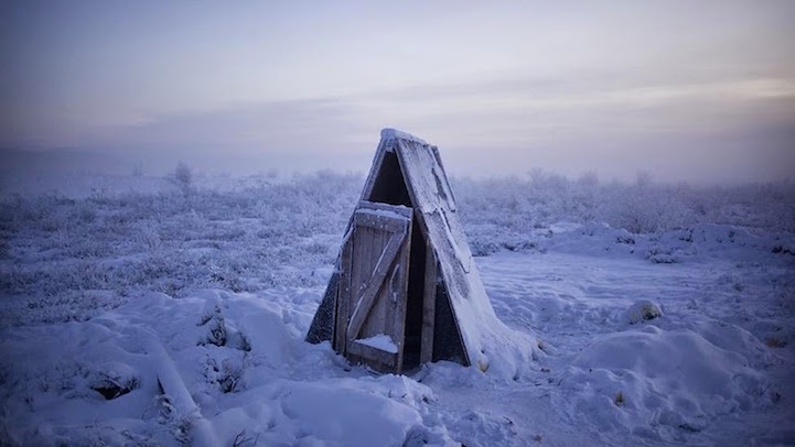 A toilet on the tundra at a gasoline stop on the road to Oymyakon. A sharp spire of frozen excrement rose almost to ground level from the pit beneath.