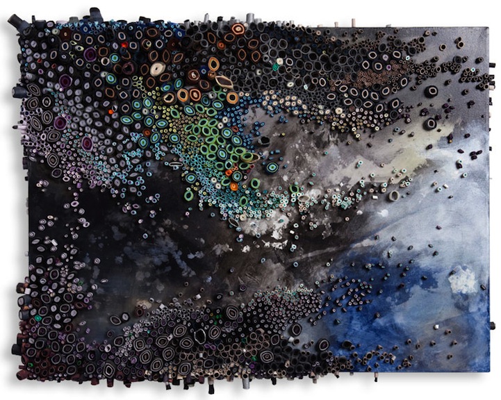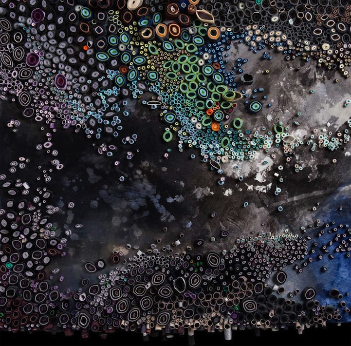 Using rolls of paper and acrylic on canvas, Amy Eisenfeld Genser creates textures and patterns against rich backgrounds that resemble underwater scenes. Each piece is reflective of the stony corals and polyps that one might see while scuba diving near a coral reef.