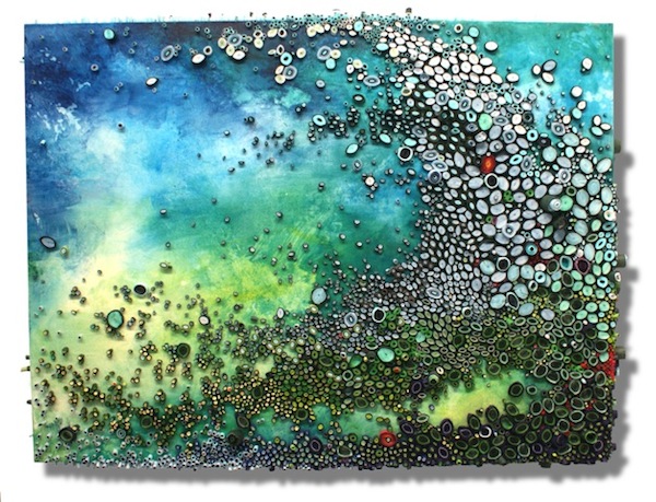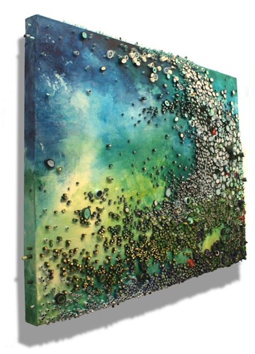 A side view of each piece provides a three dimensional depth to an already tactile painting. Her mixed media works are so greatly detailed, viewers will want to reach out and touch the rounded shapes created from spirals of recycled paper, or the textures that are created from a smattering of acrylic across the canvas.