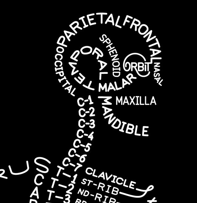Designer Aaron Kuehn has just finished up his latest typographic piece entitled Skeleton Typogram. The skeletal system is composed of nearly every bone spelled out, each representing their specific part. A total of 676 letters were used in creating this poster. You can order a limited addition screen print of it through Kuehn's website. Be sure to also check out his typographic bicycle, as well.