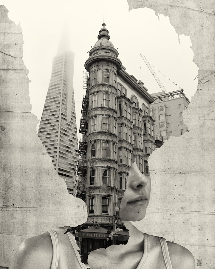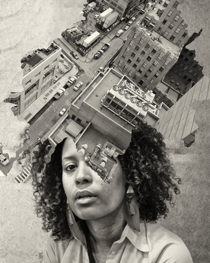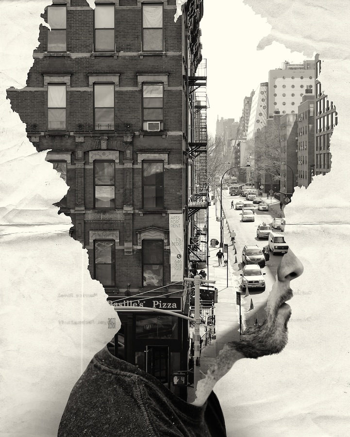Andrea Costantini's photo manipulations depict daydream thought bubbles by blending head shots with images of architecture and cityscapes. The Washington D.C.-based illustrator captures human subjects displaying thoughtful expressions as photos of picturesque streets and buildings hover over or extend out of their heads. The series, titled Where Is My Mind, seems to capture the essence of daydreaming about faraway places with promising potential, or dwelling on the deluge of daily responsibilities in a bustling metropolis.