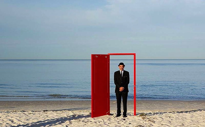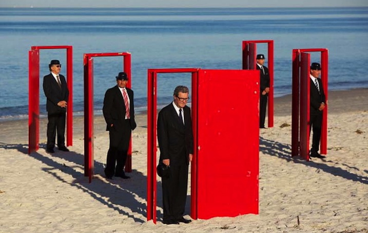For the surreal installation, Baines placed a series of red doors in the sand. Local men, including Common Ground Adelaide chairman Alexander Downer, contributed $1,500 each to the charity in order to participate, dressing in suits and bowler hats and gathering together on the beach. At the same moment, the men stood in the open red doorways as a symbol of the many possibilities that the future holds. Baines photographed the performance and plans to produce a painting of the experience to be auctioned off at an event in May.