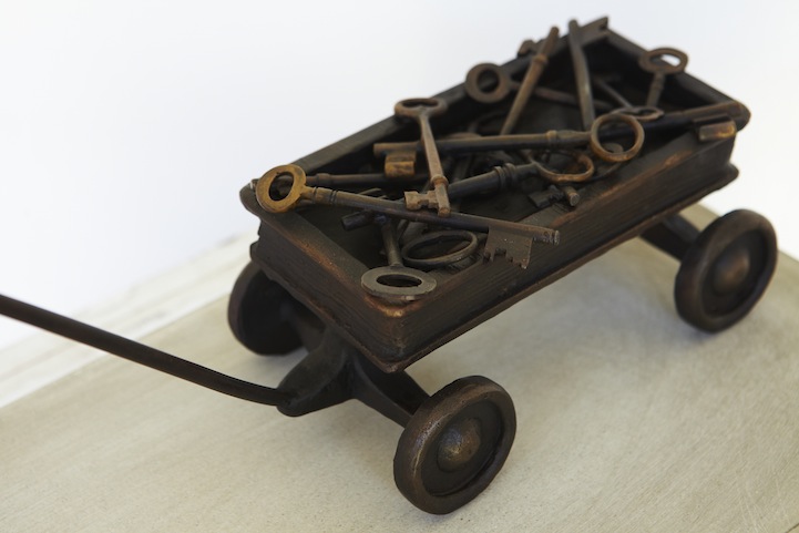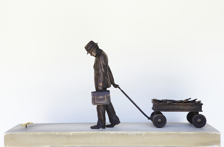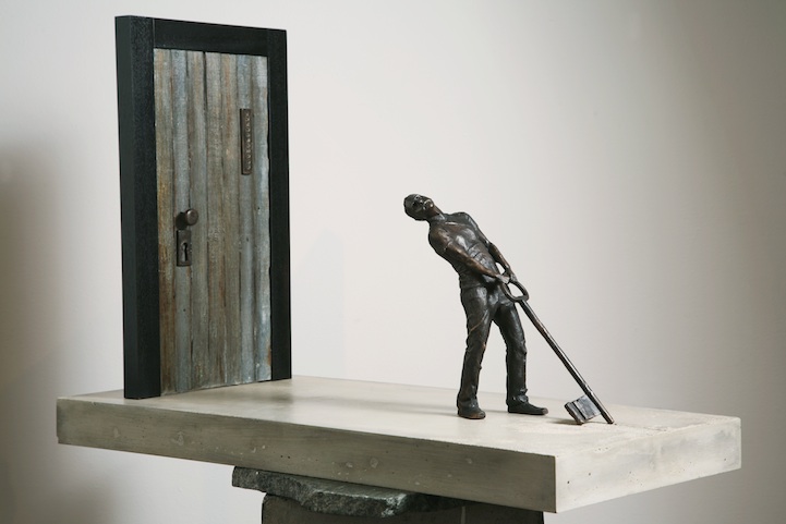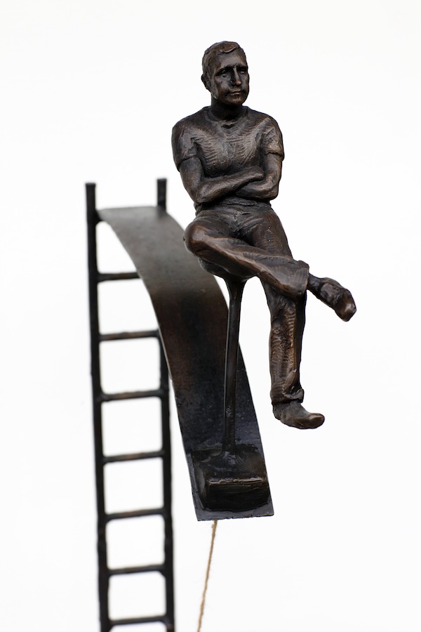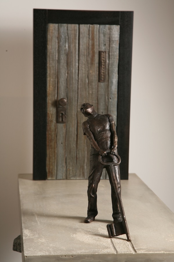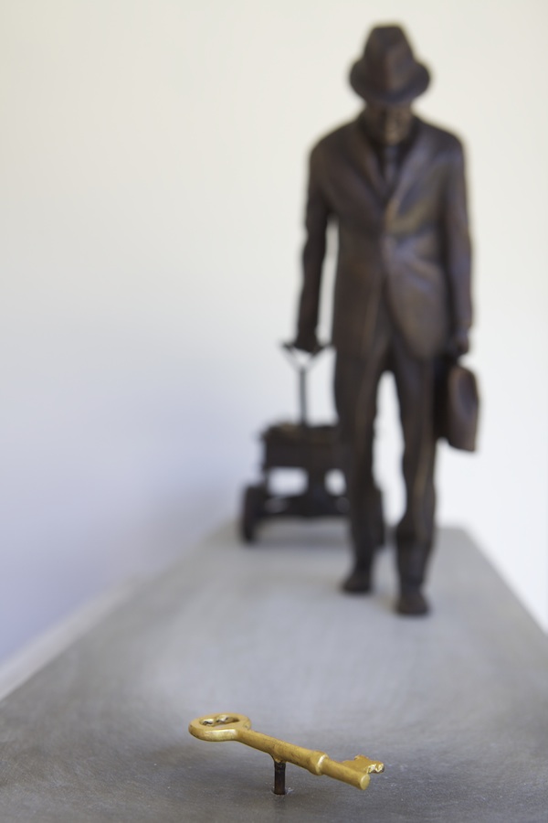 In this bronze and cement sculpture, Andrew depicts his view of hope. Though the old man has seemingly tried everything and looks ready to give up, if he just keeps walking, he will soon trip over the gold key.