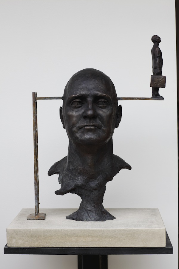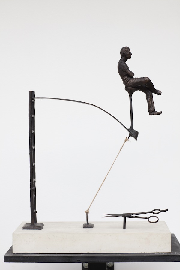 In this self-portrait of bronze, cement, string, and steel, Andrew wanted to create a sculpture depicting his basic life philosophy. Stability is an illusion; at any moment, the string can be cut, instantly changing one's entire life for better or worse. Anybody can pick up the scissors.