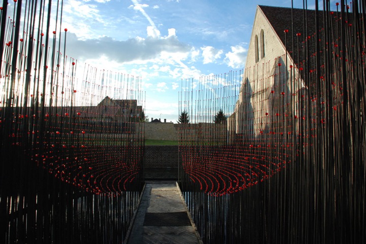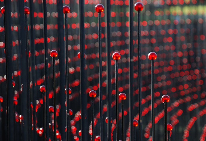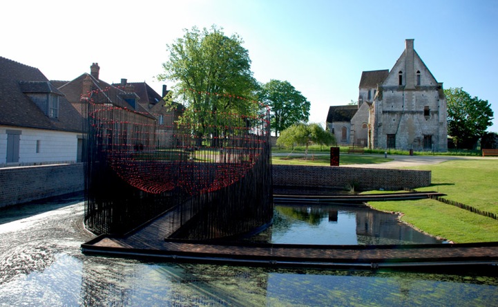 Co-founders of Cao | Perrot Studio, a bicontinental creative studio based in Los Angeles and Paris, Andy Cao and Xavier Perrot have recently unveiled their latest installation titled Red Bowl. The skilled landscape artists have constructed this structure consisting of 5,000 black rods, arranging the tall poles in a circle around a wooden walkway over a pond at the Maladrerie Saint-Lazare in Beauvais, France. Each of the thin, metallic pillars that vary in height are adorned with red glass domes, creating the illusion of a large red bowl looming over this specific area of the former leprosarium, where those afflicted with leprosy used to be treated.