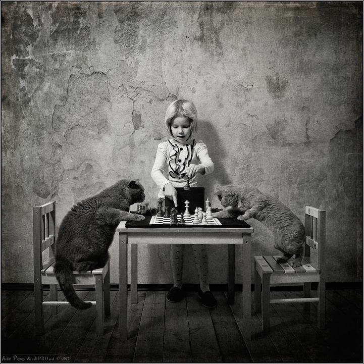 With two lovable feline friends to play with now, six-and-a-half-year-old Katherine has double the fun. Her father faithfully documents the adventures of the adorable trio, capturing images of the three balancing on books, playing chess, having a tea party, solving tough equations on a whiteboard, and getting into all sorts of shenanigans.