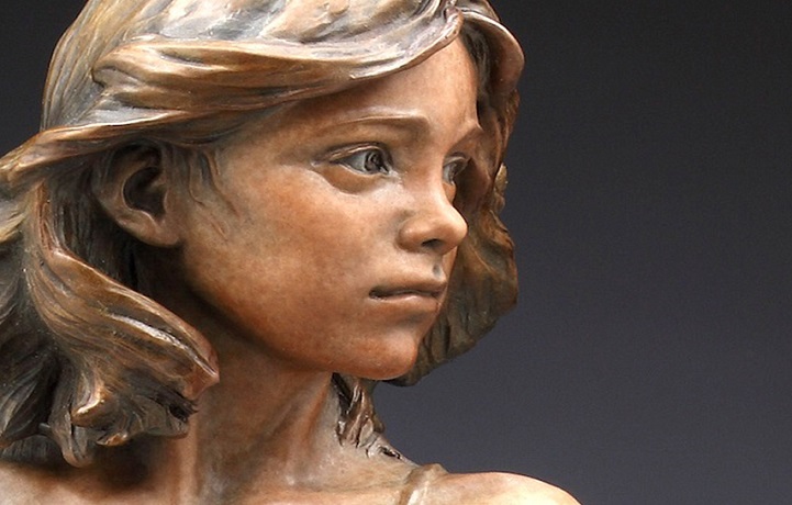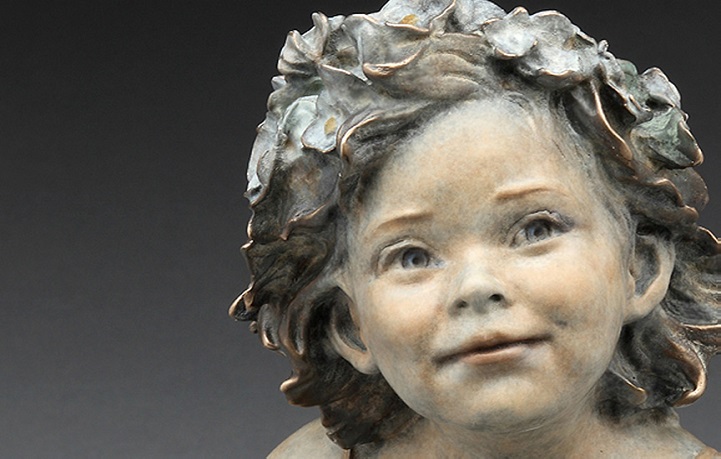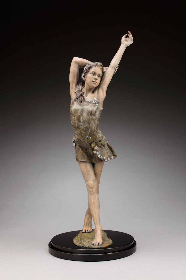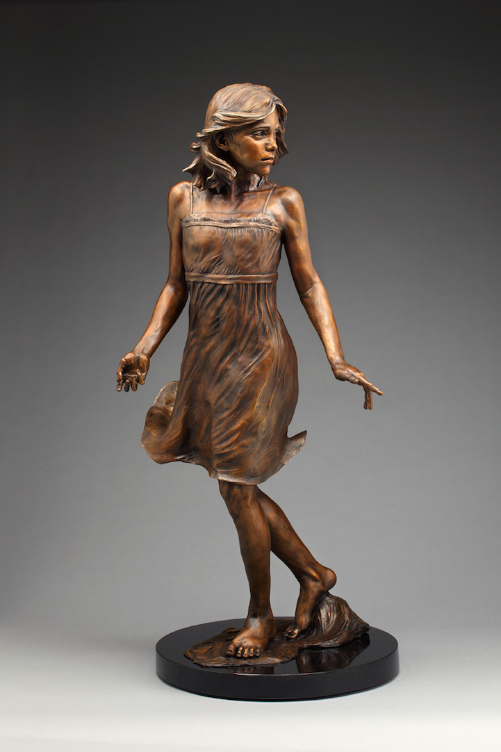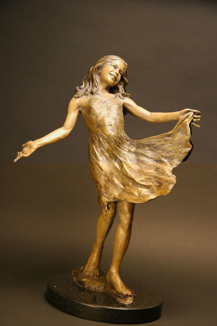 Angela Mia De la Vega breathes a realistic beauty into each of her lifelike bronze sculptures. For De la Vega, sculpting is an opportunity to capture what is happening around her, a way to share her vision with the world before it fades away. Her body of work is particularly saturated with youthful figures engaged in energetic and playful activities. Within her forms, she expertly employs light and shadow in order to inspire an emotional connection between her work and her audience, so that one may see a reflection of life within each sculpted face.
