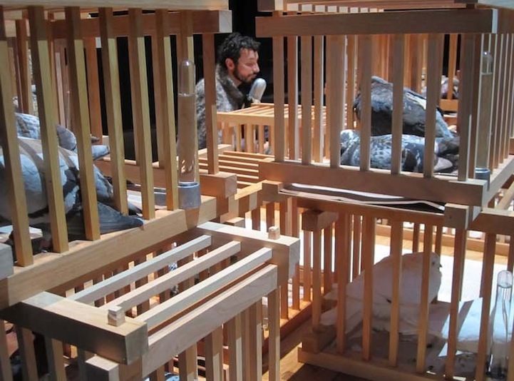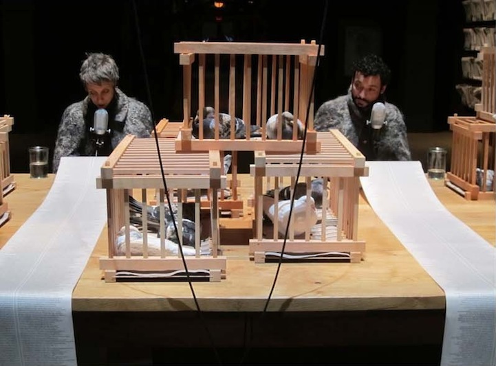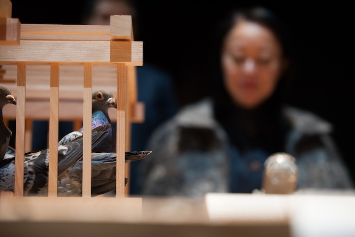 In addition to the swing-controlled curtain, there are stacks of cages containing 42 homing pigeons and a station at which two readers speak into microphones. The text they are reading imparts knowledge that guests to the exhibit are free to choose to listen to. Knowledge is, after all, a choice one makes to attain. There is also a station where the artist herself is positioned, viewing the entirety of the exhibit through a mirror as though she can only gauge the success of the event by evaluating herself.