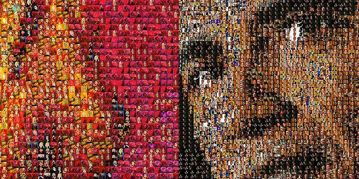 At first glance, the viewer sees a portrait, often a familiar face like Barack Obama or Scarlett Johannson. But in reality, Schudel collected images from the Internet and worked the small pieces together like a puzzle, matching tones and color from the original photograph to make something new.