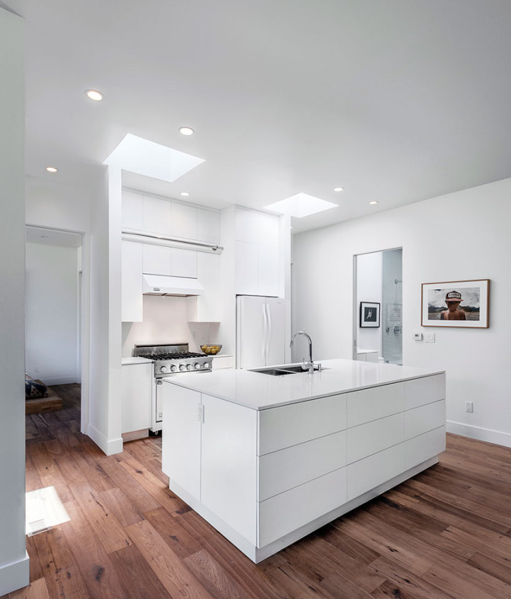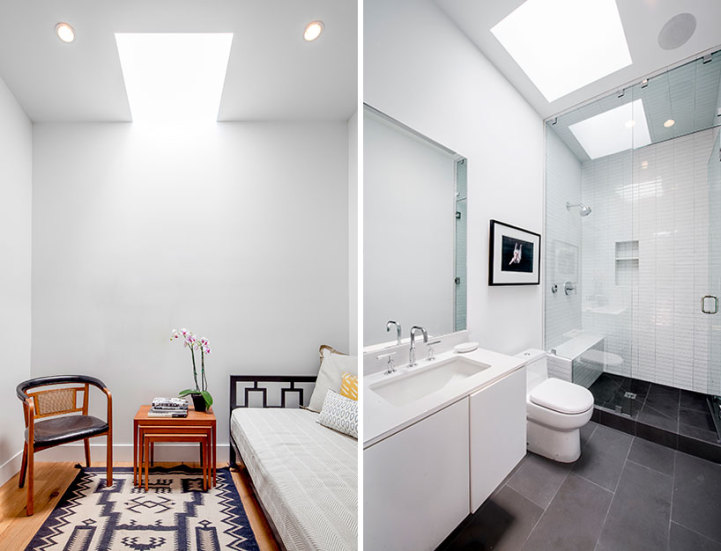 Since local building codes require two private parking spaces for each home, the architects behind the design decided to take advantage of the mountainous landscape and build the home downward, below the crest of the hill. This allows for an open-air garage that sits on top of the roof of the home, while the living areas all lie beneath it.