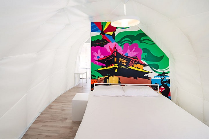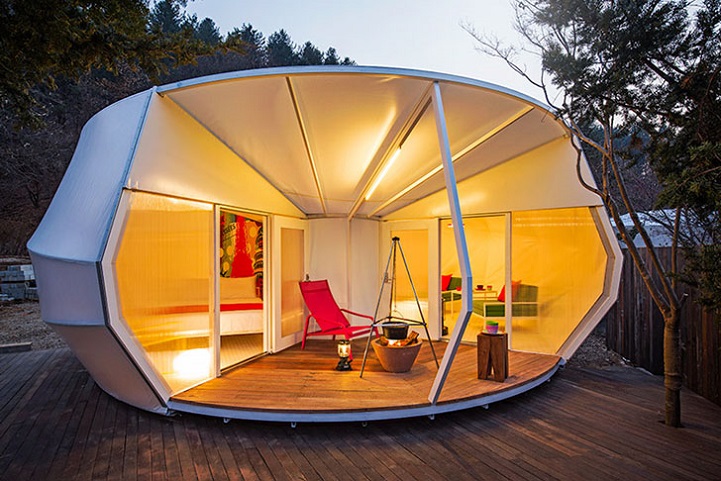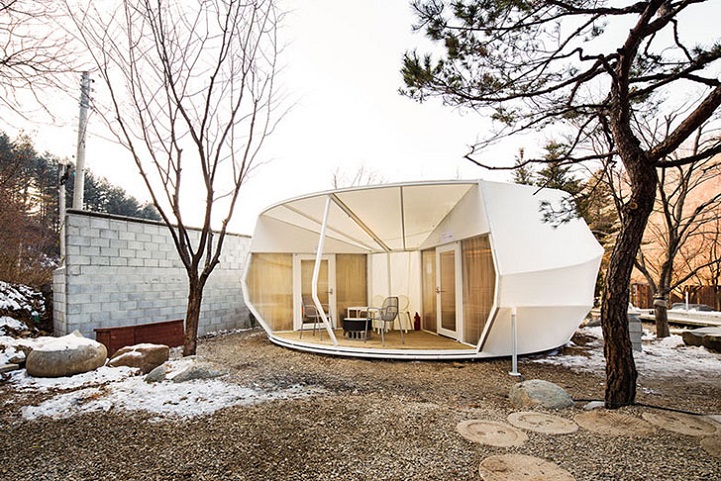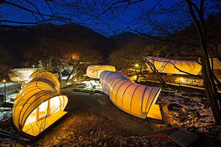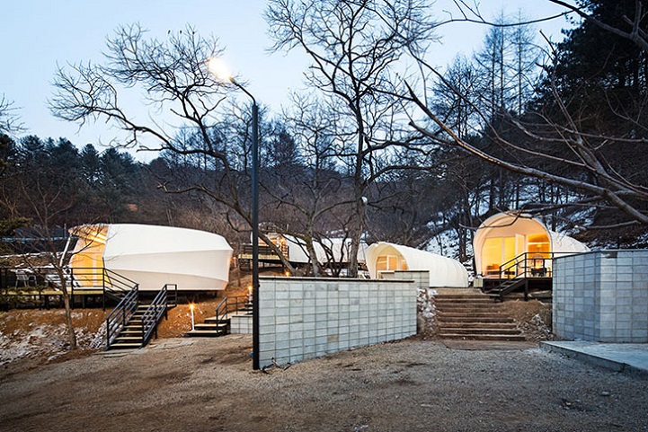 Erected on a camp-site in remote Yang-Pyeong, Korea, the Archiworkshop prototypes are waterproof, fire-resistant, and UV-proof, allowing one to experience nature without worrying about hazards. They come in two shapes–a long, curved tent suitable for rough terrain; and a cosy, hollow, circular shape that comes complete with a tiny patio set-up. The furniture within the tents is custom made, featuring a modern white interior balanced with wall murals painted by local artists. These high-tech tents let you experience the great outdoors without sacrificing any of the comforts of home.