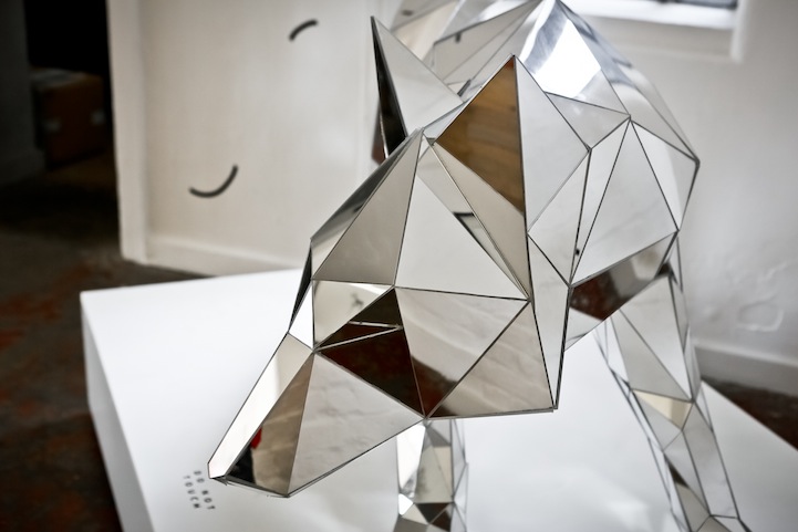 London-based artist Arran Gregory's work spans from illustration to minimalist sculptures. In a recent exhibit at The Print House Gallery, titled WOLF, Gregory featured two of his Mirrored Animals sculptures alongside a variety of his detailed illustrations. In the sculptures, Gregory uses strong geometric shapes and angles, combined with a reflective mirrored material, to create the futuristic animal figures. The two pieces at WOLF include (of course) a free standing wolf as well as the head of a rhinoceros mounted on the wall.