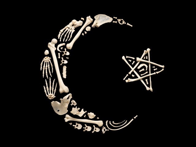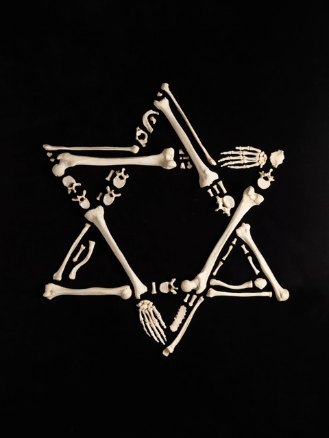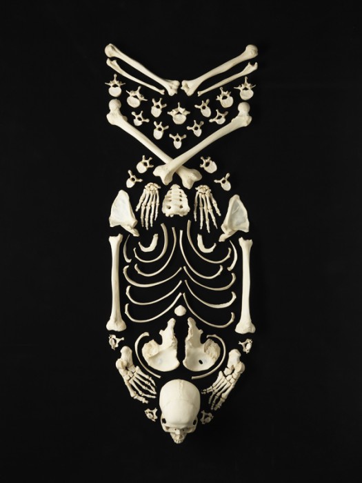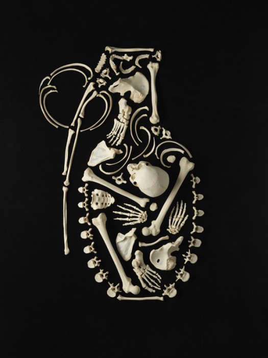 Francois Robert spent hundreds of hours arranging the real bones of a single human skeleton into a series of striking iconic shapes, each five or six feet wide. He titled the beautiful yet eerily haunting series, ‘Stop the Violence.'” “In the mid-90's, during an auction from an old school, I purchased 3 metal lockers and to my surprise one of them held a real, full size articulated skeleton,” he says. “For years I had it displayed in one of the rooms in my studio and I often wondered what else I could do with it. Finally the idea came to me to explore the idea of disassembling the skeleton and rearranging the bones, and from that process came the series ‘Stop the Violence.'” Robert confesses that more than anything else he is motivated by the fear of death. “The bones are something left behind, a form of memory. I try to treat that person on my studio floor with respect.”
