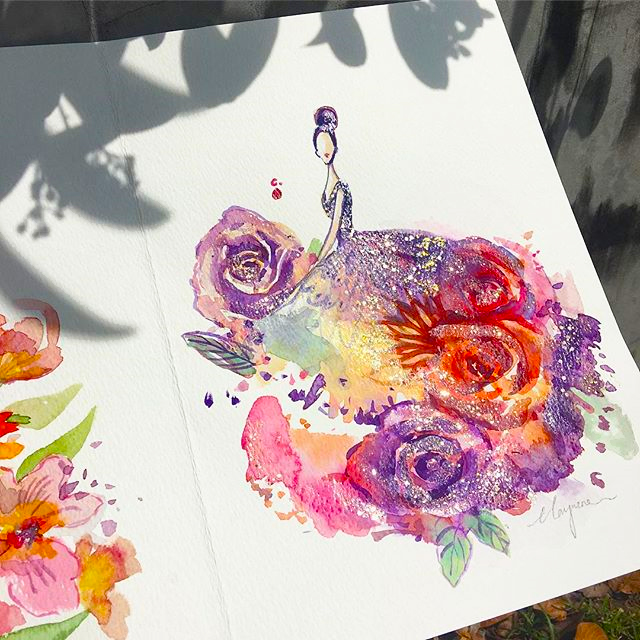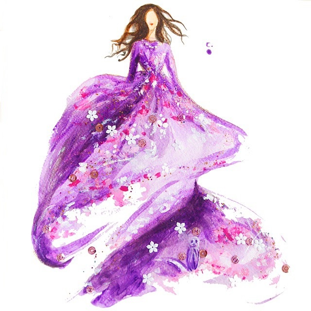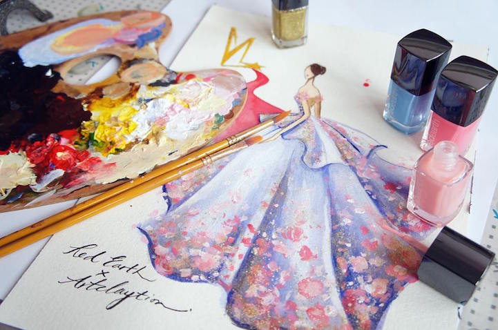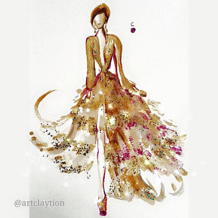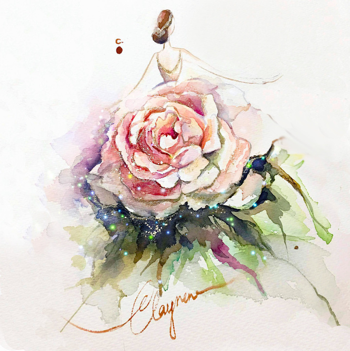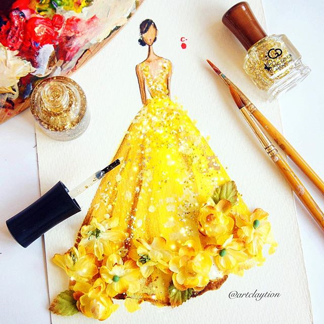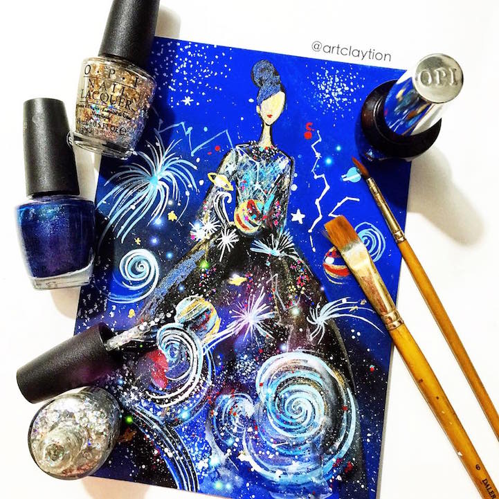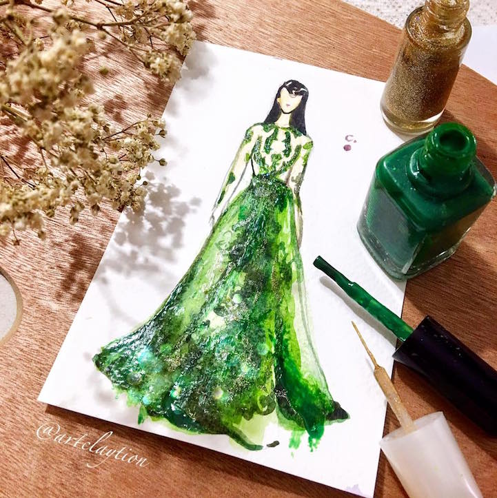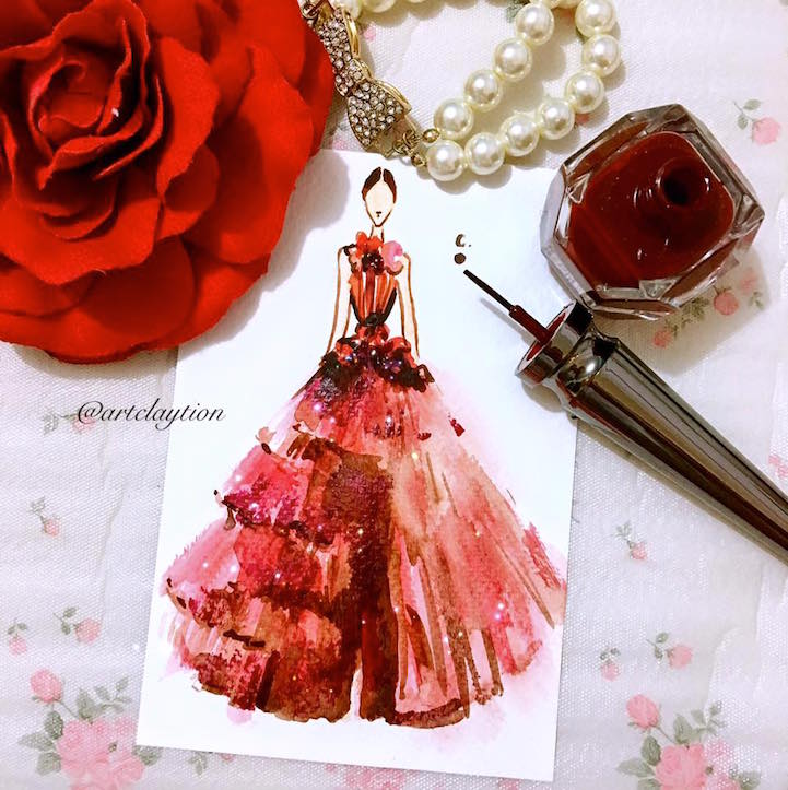 Nail polish is no longer limited to fingers and toes. Chan Clayrene of Artclaytion uses nail polishes, matte and sparkly alike, as the ink for her glamorous illustrations of haute couture gowns. Her designs are inspired by luxury labels, such as Dolce & Gabbana, Valentino, and Ralph & Russo, as well as by her own creative imagination. Clayrene's nouveau watercolor art is dreamlike in texture—with edges evaporating into the blankness of the paper—while her colors are bold, thanks to the vivacious hues of her nail polish palette. This blooming effect is not surprising, given that many of her fashionable illustrations include drawn, or sometimes even real, flowers that burst from the page with three-dimensional power.