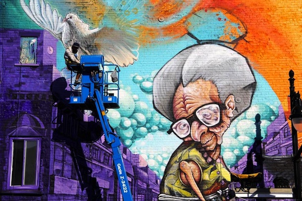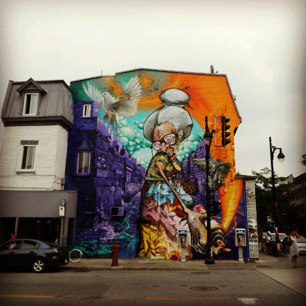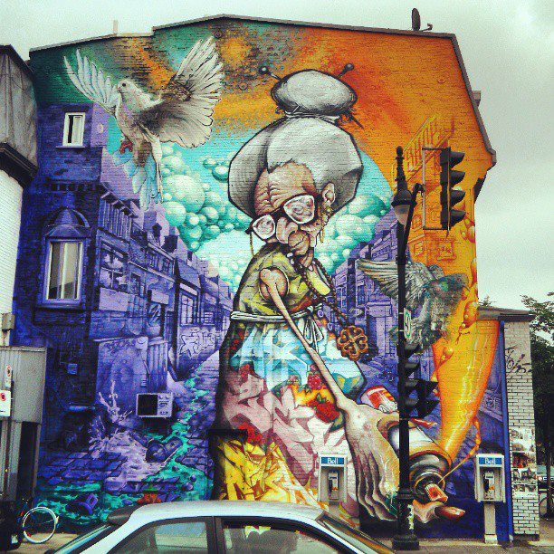 It's been a few years since we wrote about Montreal-based artist collective A'shop but the team is back. One of their latest works was for the MURAL street art festival that recently took place on Saint-Laurent Boulevard, in downtown Montreal. As one of twenty street artists that came from all over the world, A'shop painted one huge side of a building in some eye-popping colors. Their piece featured a colorfully dressed grandma spray painting into the sky. (Check out the amazing details like that sick graffiti dress!)