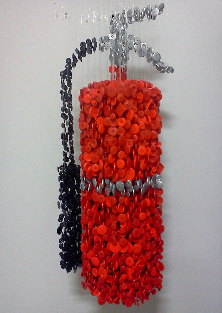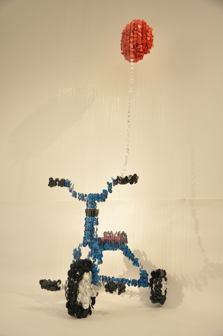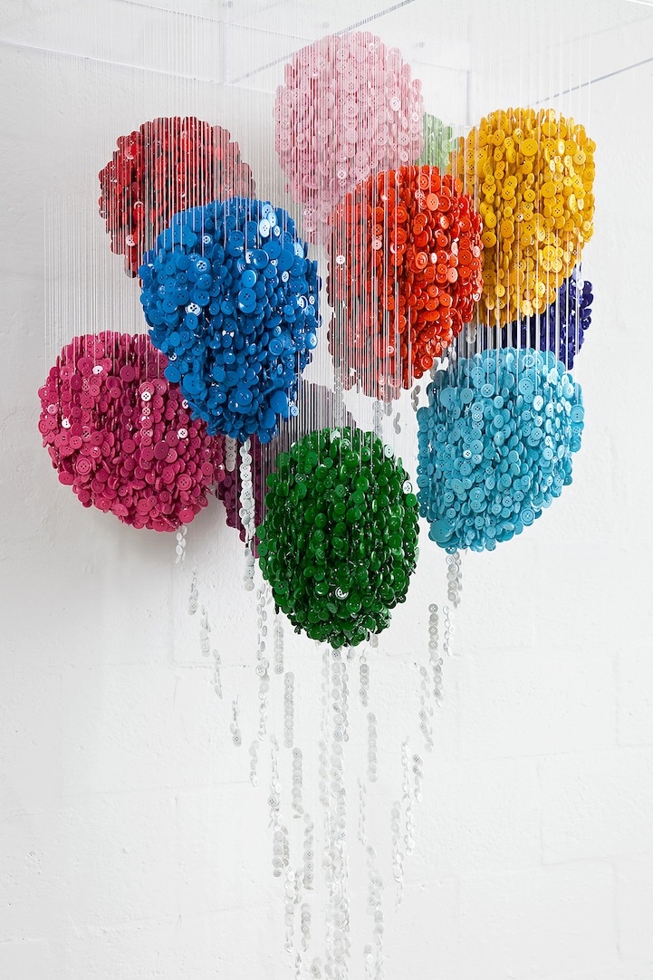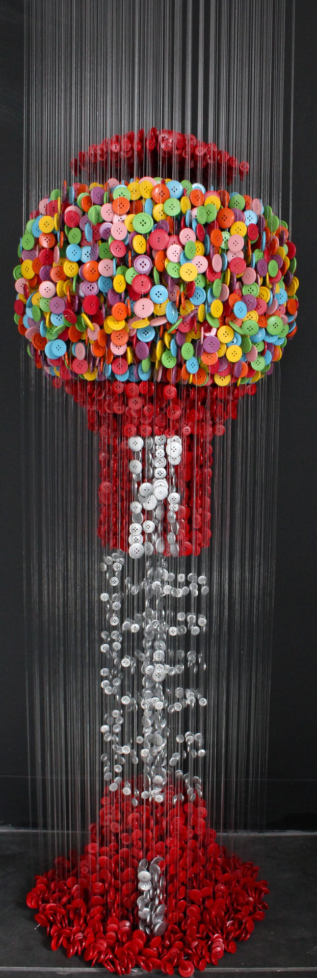 Esquivel's clever creations exhibit an astute understanding of spatial definition and a keen eye for detail, not to mention a lighthearted feast for the eyes. Each time-consuming piece carefully coordinates the varied shapes and colors that buttons come in to redefine a space with an illusionary sculpture that is fragile enough to disintegrate at the flick of one's hand.