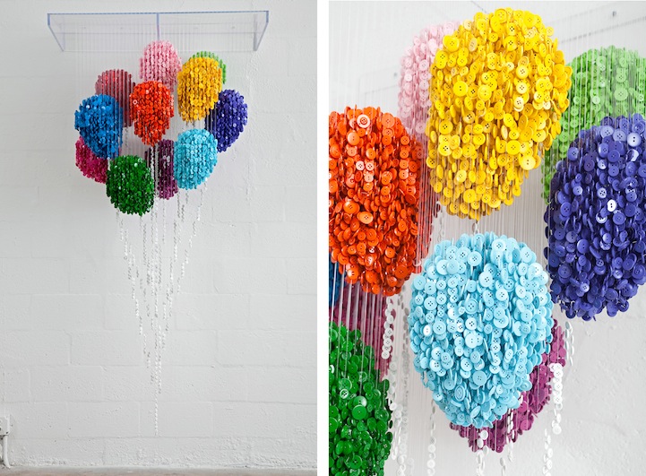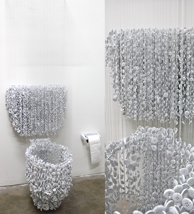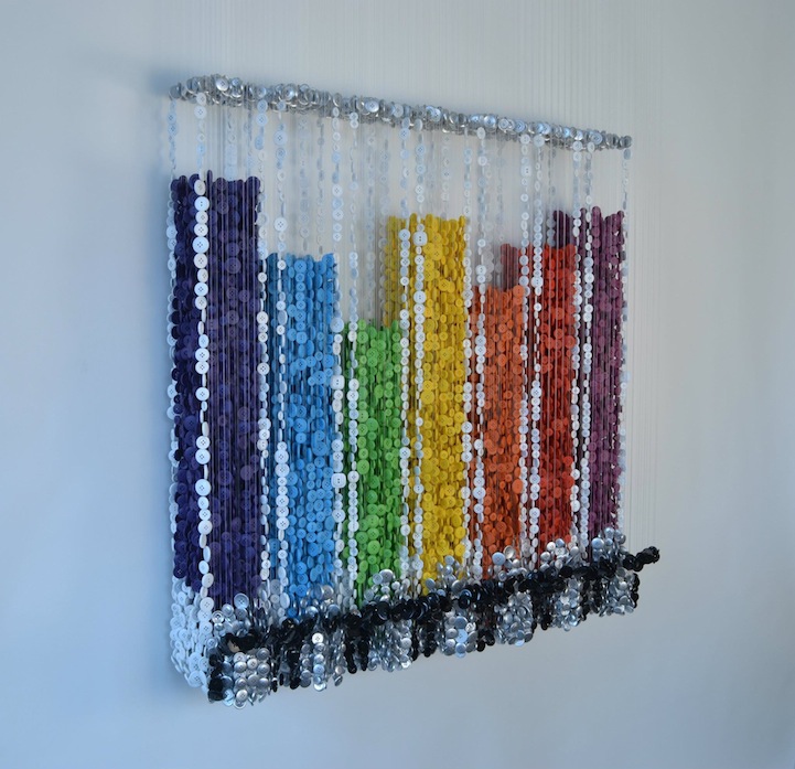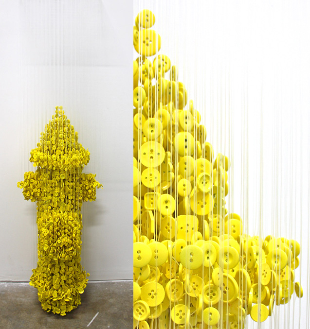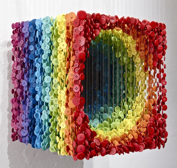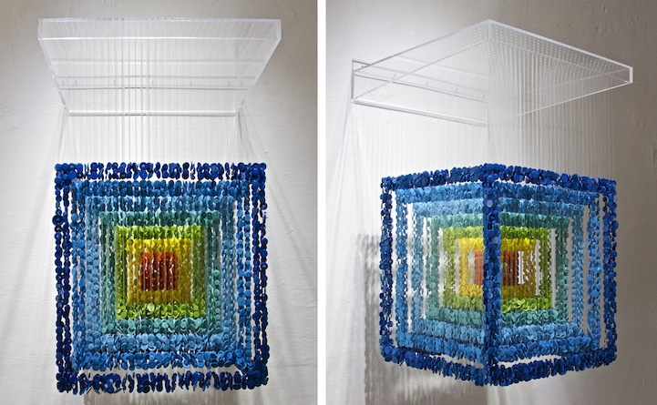 Miami-based artist Augusto Esquivel realistically duplicates objects by suspending thousands of sewing buttons on mere strings. Each strand of his incredible sculptural pieces work with their adjacent string of buttons to create colorful replicas of everything, from a basic geometric cube to a stone fountain covered in flowers and spouting water.