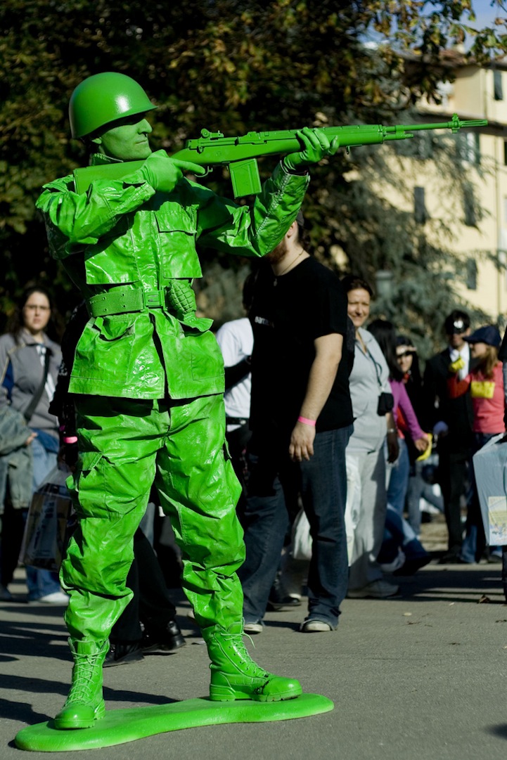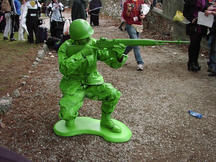 This bright green toy solider costume is totally awesome! The glossy paint really sells the illusion that the guy is made of plastic. This gives the real-life Banksy panting a run for its money for best costume of the year!