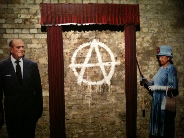 The Independent writes “The foyer boasts a few of Banksy's latest artworks. Against one brick wall, effigies of the Queen and Prince Philip are seen unveiling a big white anarchist sign. On another is a big Hollywood-style sign for production company, Paranoid Pictures. In a corner is a fake bonfire, burning a selection of 18th- and 19th-century paintings, portraits of Napoleon and Queen Victoria among them. There is an ice-cream van from which a youngish man with a goatee beard serves popcorn and soda.”