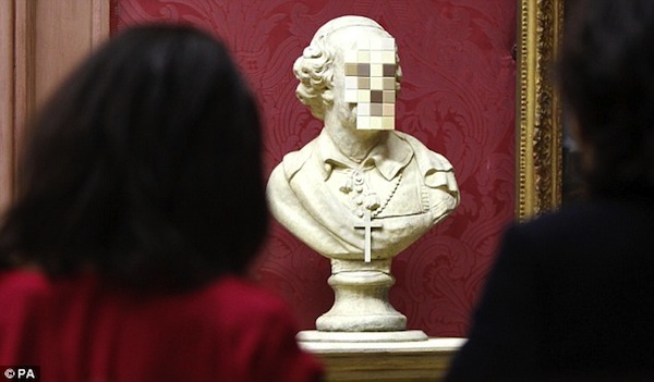 Oh, the Catholic church won't be happy about this. Banksy just unveiled a brand new sculpture called Cardinal Sin which is a 18-century stone bust of a priest with its face sawn off and replaced by blank “pixelated” bathroom tiles. It was created as a response to the child abuse scandal in the Catholic church and its subsequent cover-up.