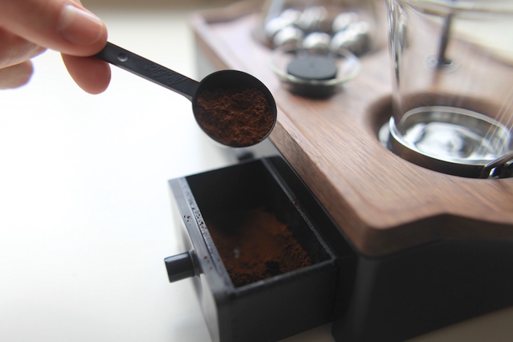 The modern, minimalist-inspired design features two primary sections: a base that has an alarm, phone charger, and small storage compartment; as well as a walnut tray that holds two glass vessels, a filter, and a funnel. An induction hob on the platter heats the stainless steel base and causes the water to boil. From there, this produces steam pressure and forces the liquid out of the original vessel and into the filter, which then brews coffee or loose-leaf tea.