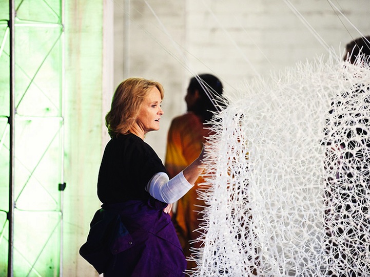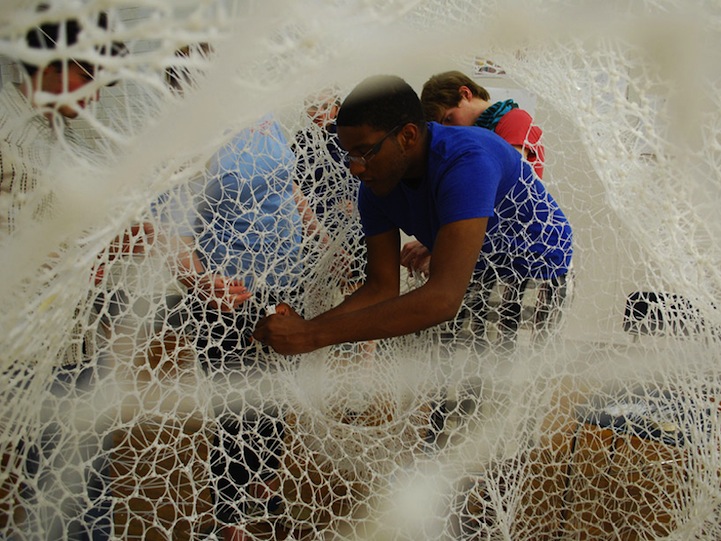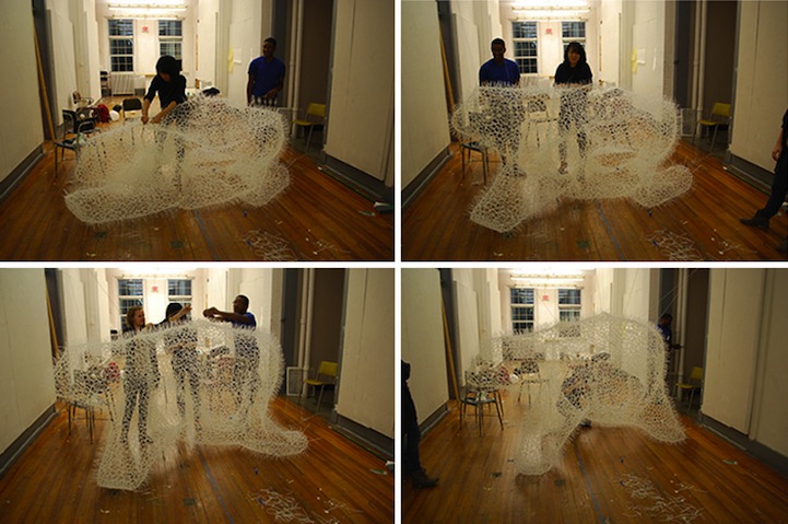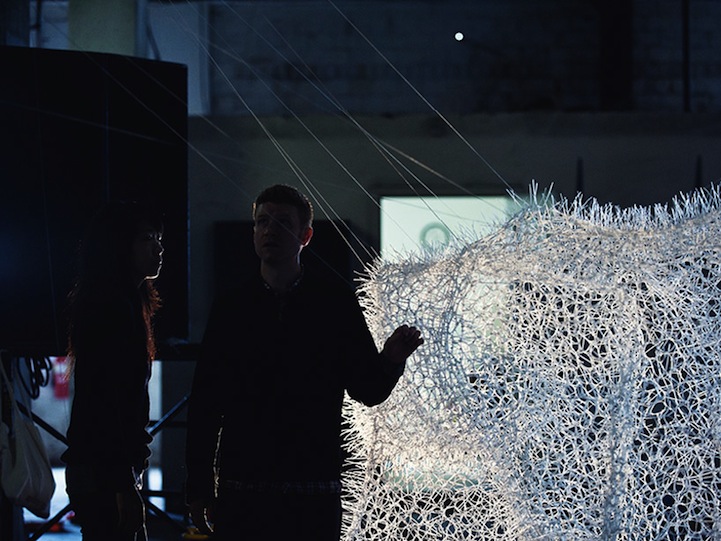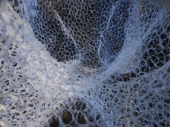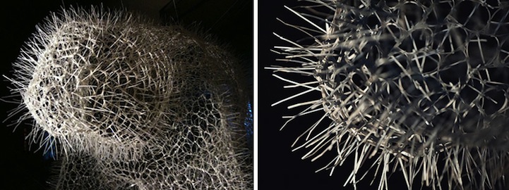 The installation is anchored to the ceiling by a cable suspension system. When illuminated, it produces a beautiful glow. How I'd love to see this in person.