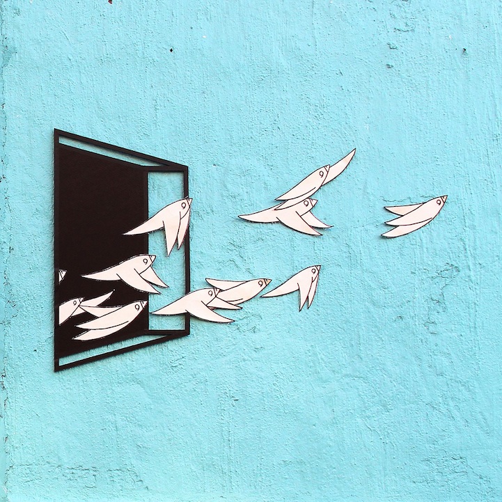 New York-based Aakash Nihalani, whose known for his stellar tape art, recently teamed up with fellow street artist Know Hope in creating this beautiful illusion. On a bright blue wall near Aakash's studio in Bushwick, Brooklyn, the two made it look like a flock of birds were entering and exiting windows. It is called Uncornered.